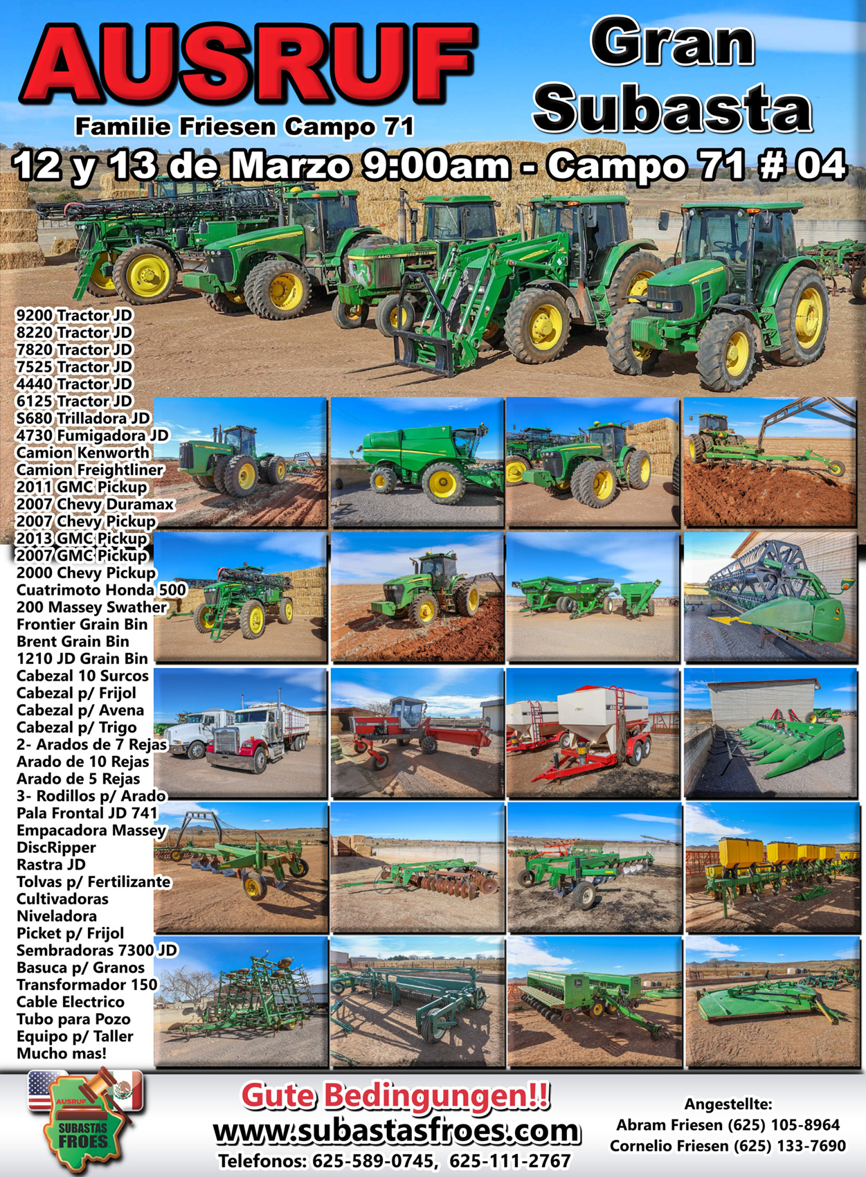 12 y 13 de Marzo 9:00am Subasta de Maquinaria Agricola Familia Friesen Campo 71 # 04