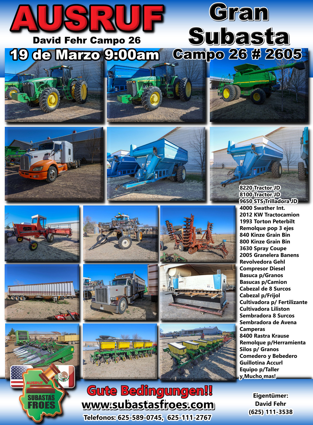 19 de Marzo 9:00am Subasta de Maquinaria Agricola David Fehr Campo 26 # 2605
